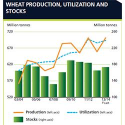 The largest increases in world inventories are forecast for China, which is heading towards another record crop, and for the EU and the Russian Federation. Although total wheat utilization is forecast to resume its growth after a decline in 2012/13, the increase would only concern wheat consumption as food, since feed utilization, which rose sharply in 2011/12 as a result of very tight supplies and high prices of coarse grains, is likely to remain close